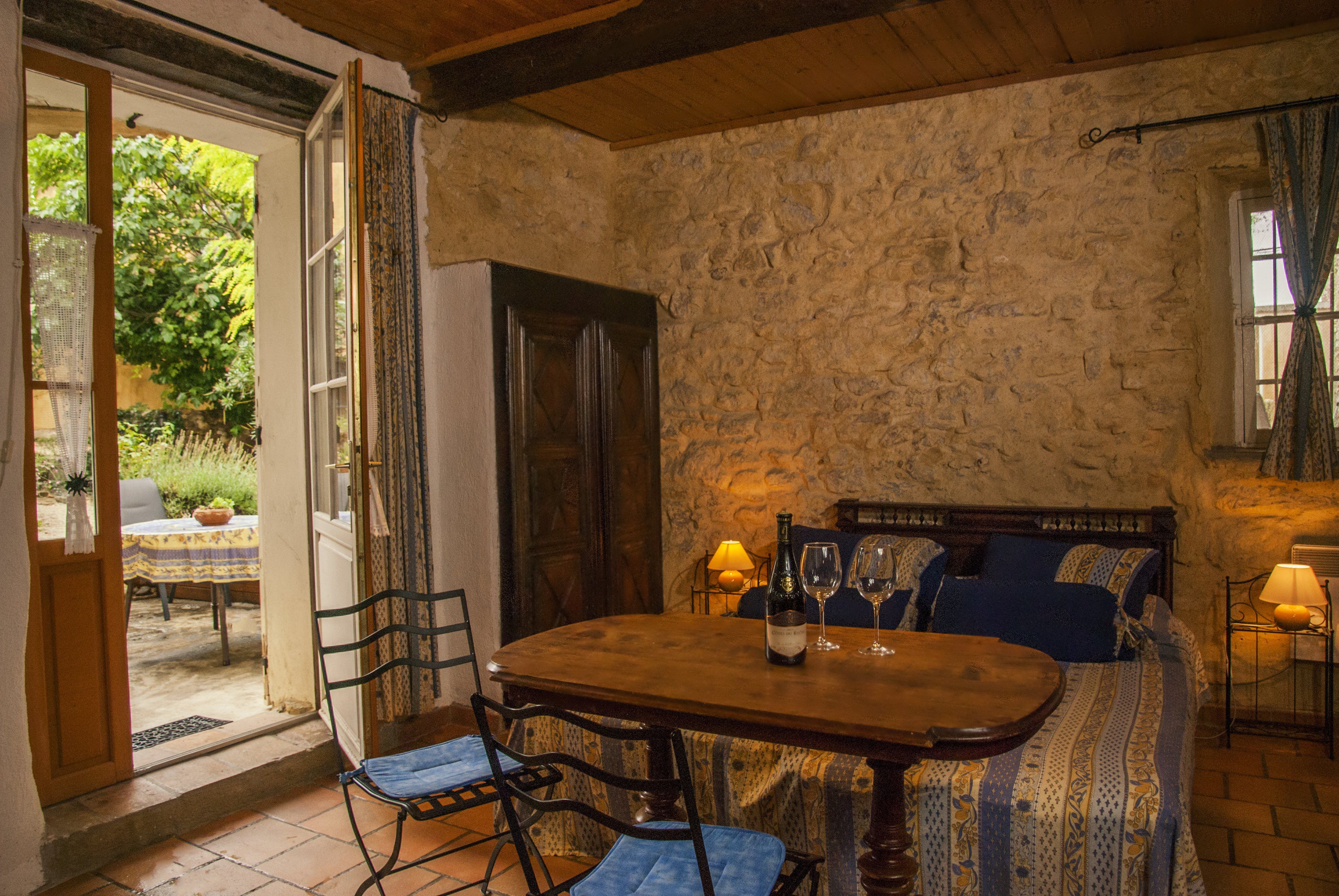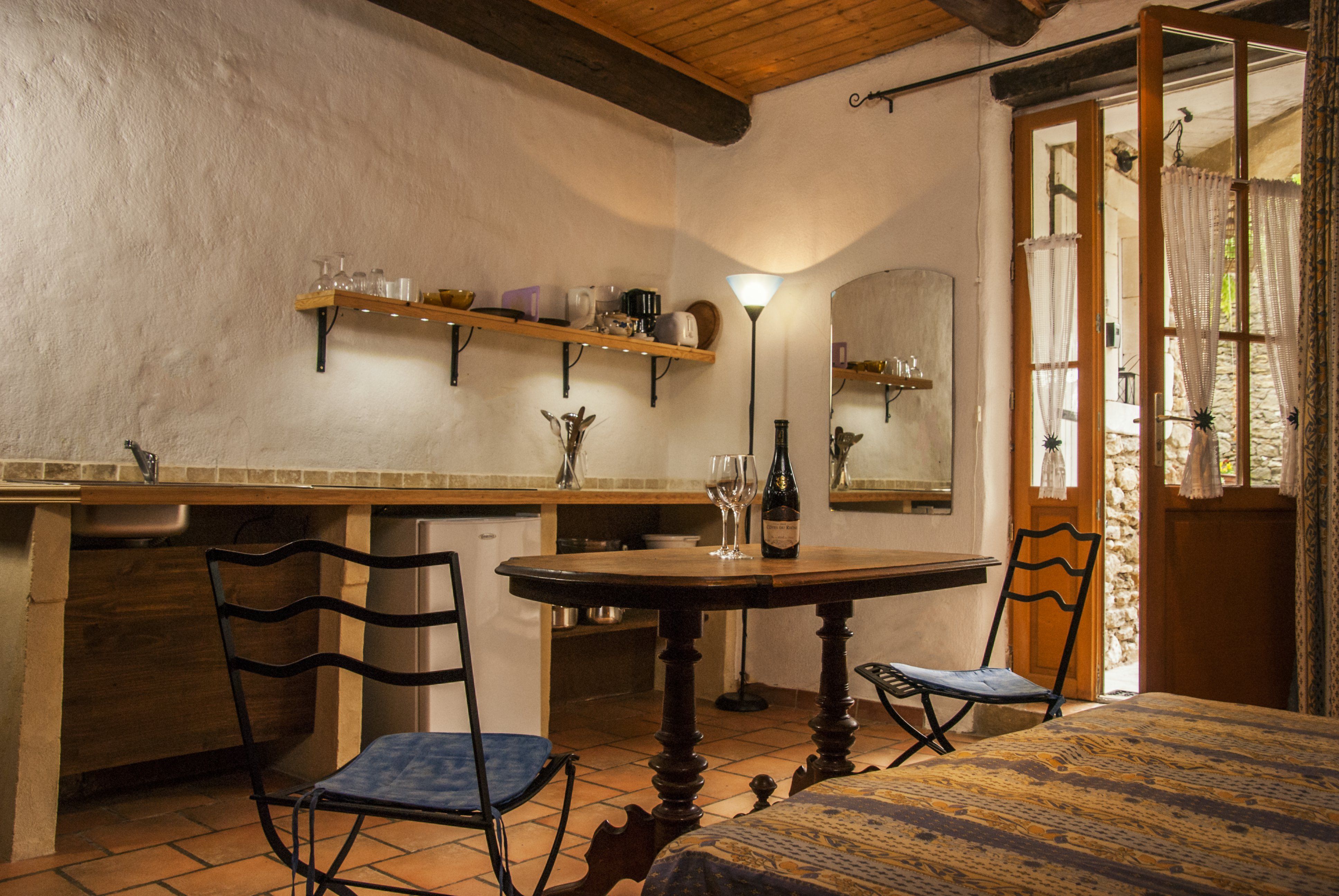 Le studio La Vieille Cheminée peut accueillir 2 personnes. Il se compose d’une pièce comprenant un coin cuisine équipé (plaque de cuisson vitrocéramique, évier, bouilloire, grille‑pain) et 2 lits simples, ainsi que d’une salle d’eau avec douche et WC.