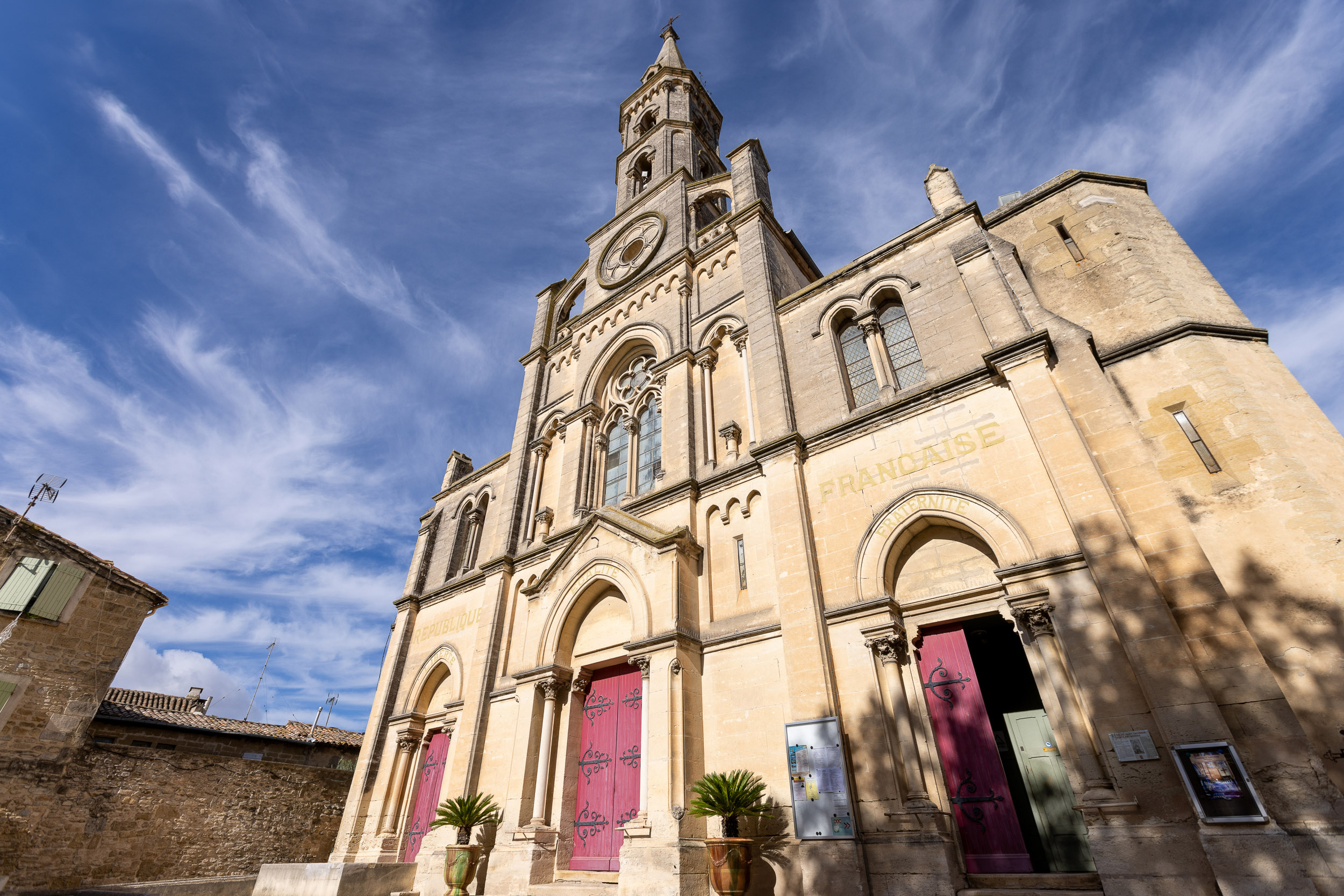 L’église, construite en 1869, est de style à la fois néo gothique et néo roman, elle est surmontée d’un clocher de 48 mètres de hauteur. On peut lire sur la façade une inscription peu courante en France « République Française. Liberté, égalité, fraternité »