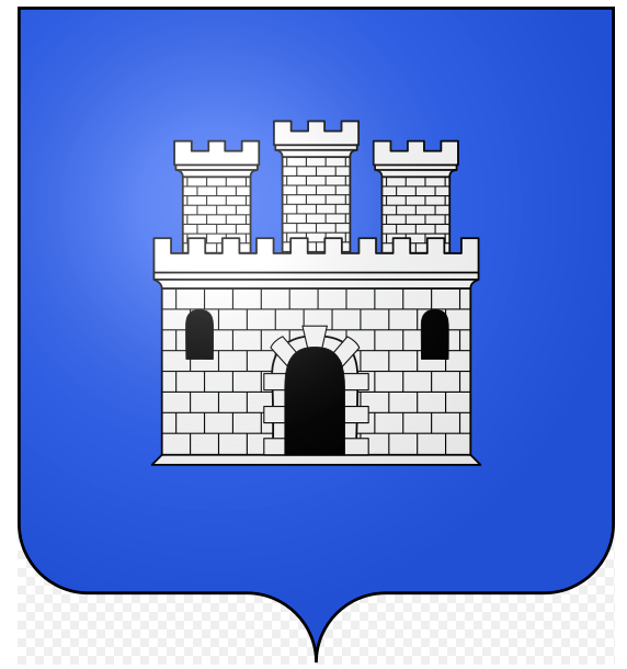 d’azur à la tour d’argent, ouverte de sable, donjonnée de trois tourelles aussi d’argent, le tout maçonné aussi de sable.