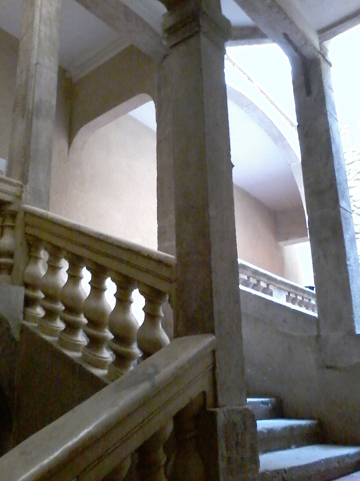 Cet escalier monumental éclairé par un puits de lumière, muni d’arcs rampants et de balustres de stuc, donne accès à la poste et à la place Rabaut St Etienne.