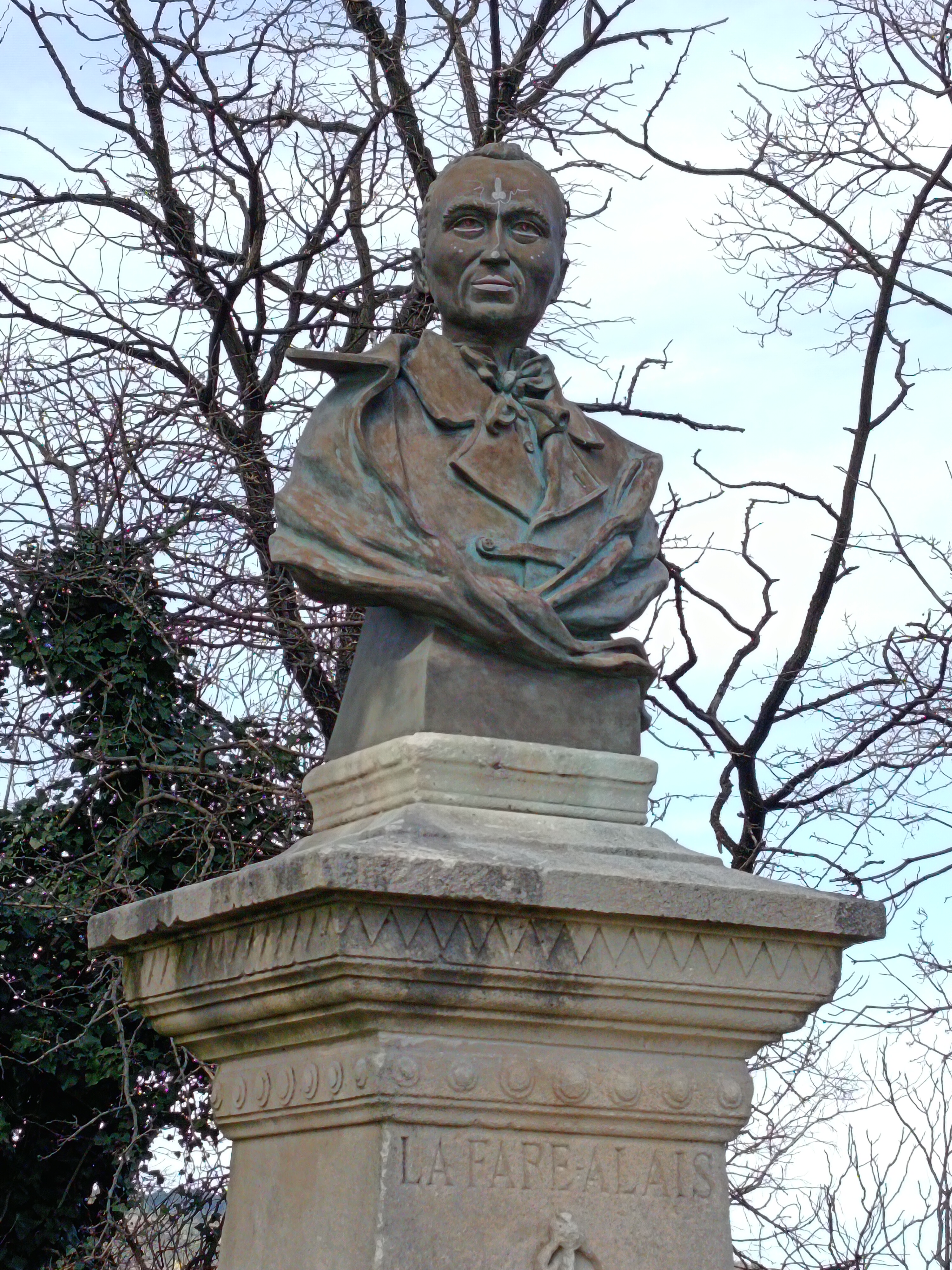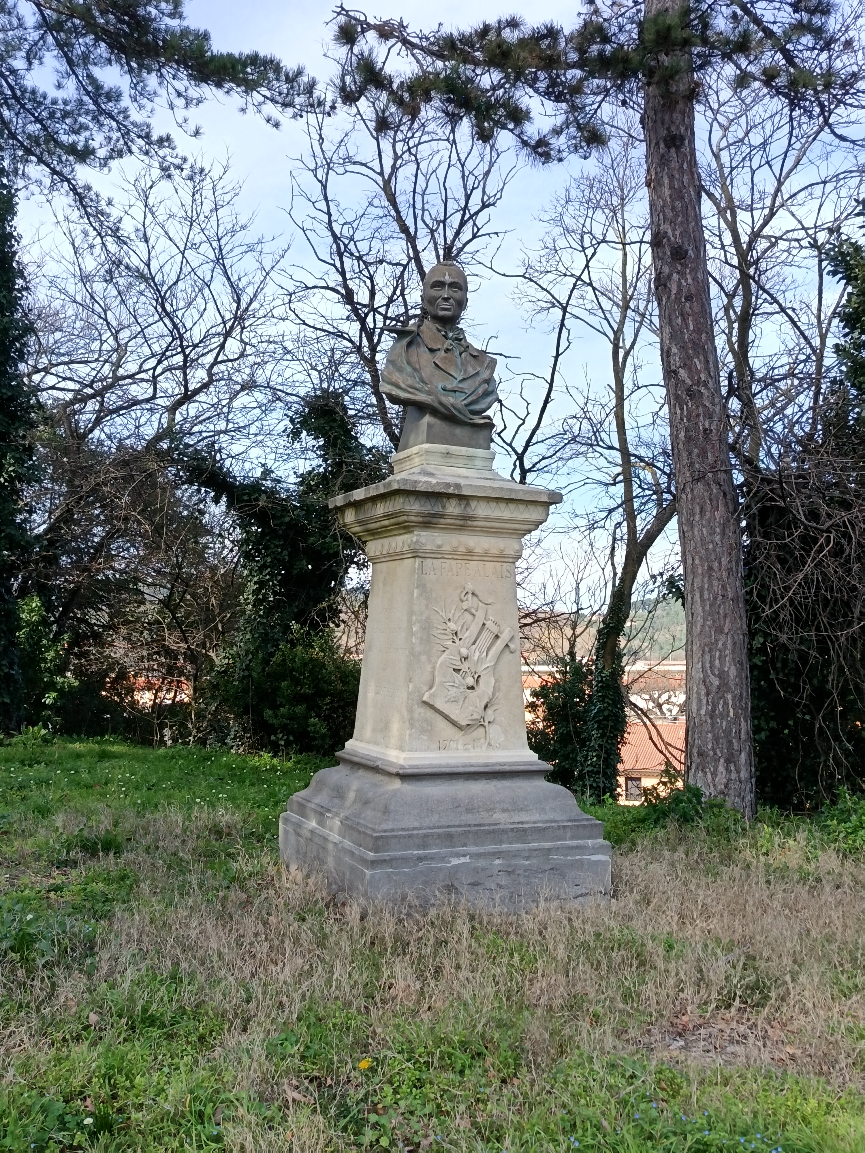 Sur la face principale : Lafare Alais 1791 1846 , bas-relief représentant une lyre et une branche de laurier