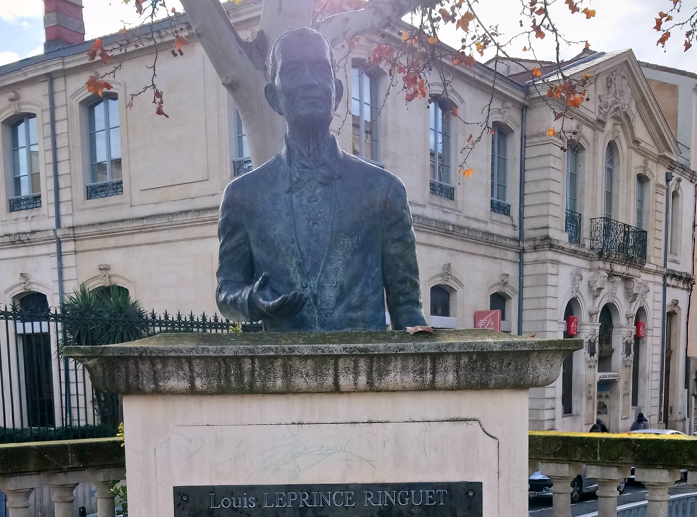 Le sculpteur du buste, Guillemette de Williencourt, n’est autre que l’une des petites-filles de Leprince Ringuet. Elle l’a représenté un bras en avant et la main ouverte, pour exprimer, dit-elle, à quel point il estimait important de recevoir autant que de donner.