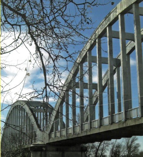 C’est un pont bow-string, c’est à dire le même principe qu’un arc. L’avantage de ce pont est que les efforts d’appuis ne sont que verticaux et le faible encombrement sous le tablier permet aux embâcles de passer facilement en cas de crue.