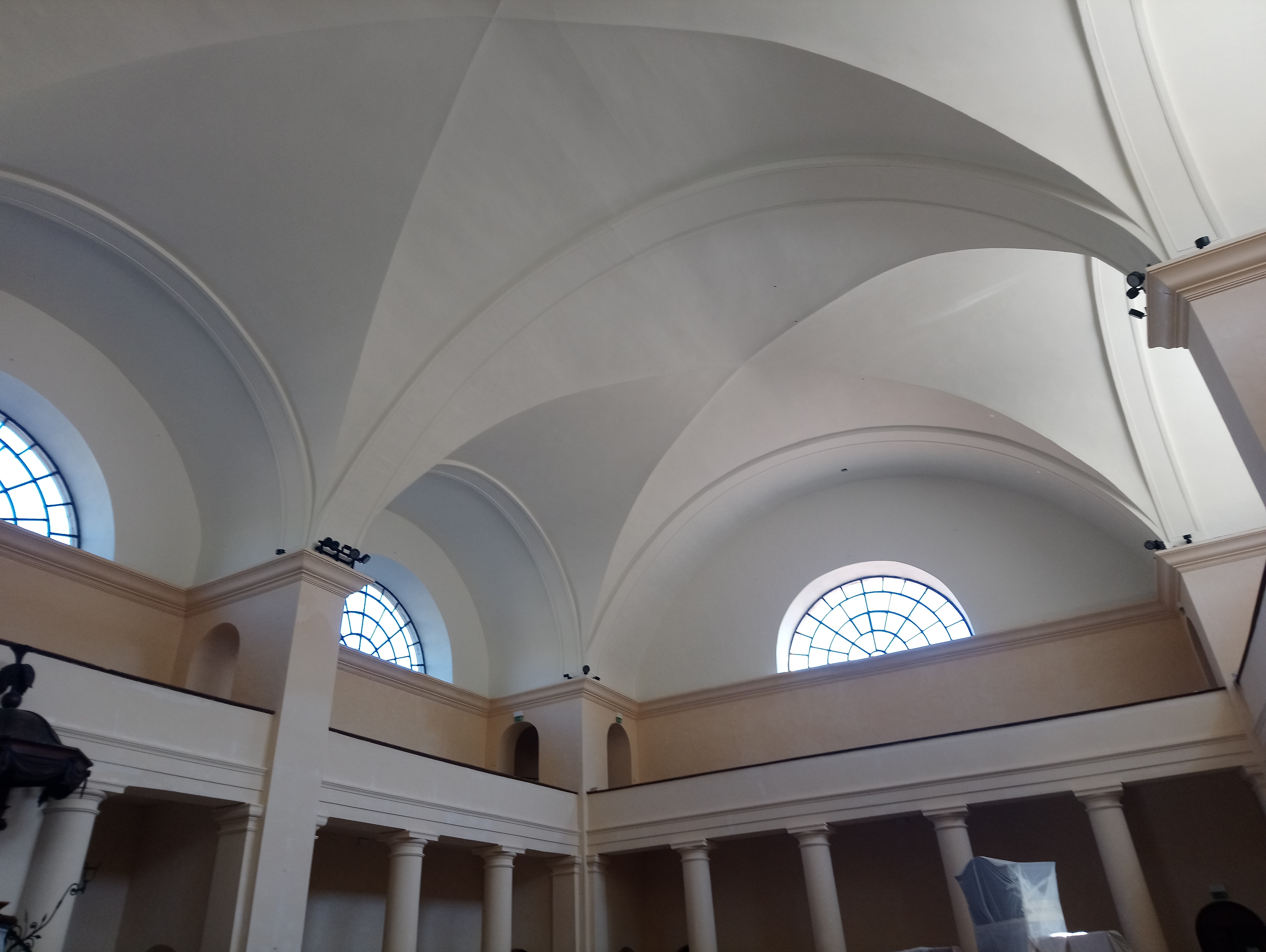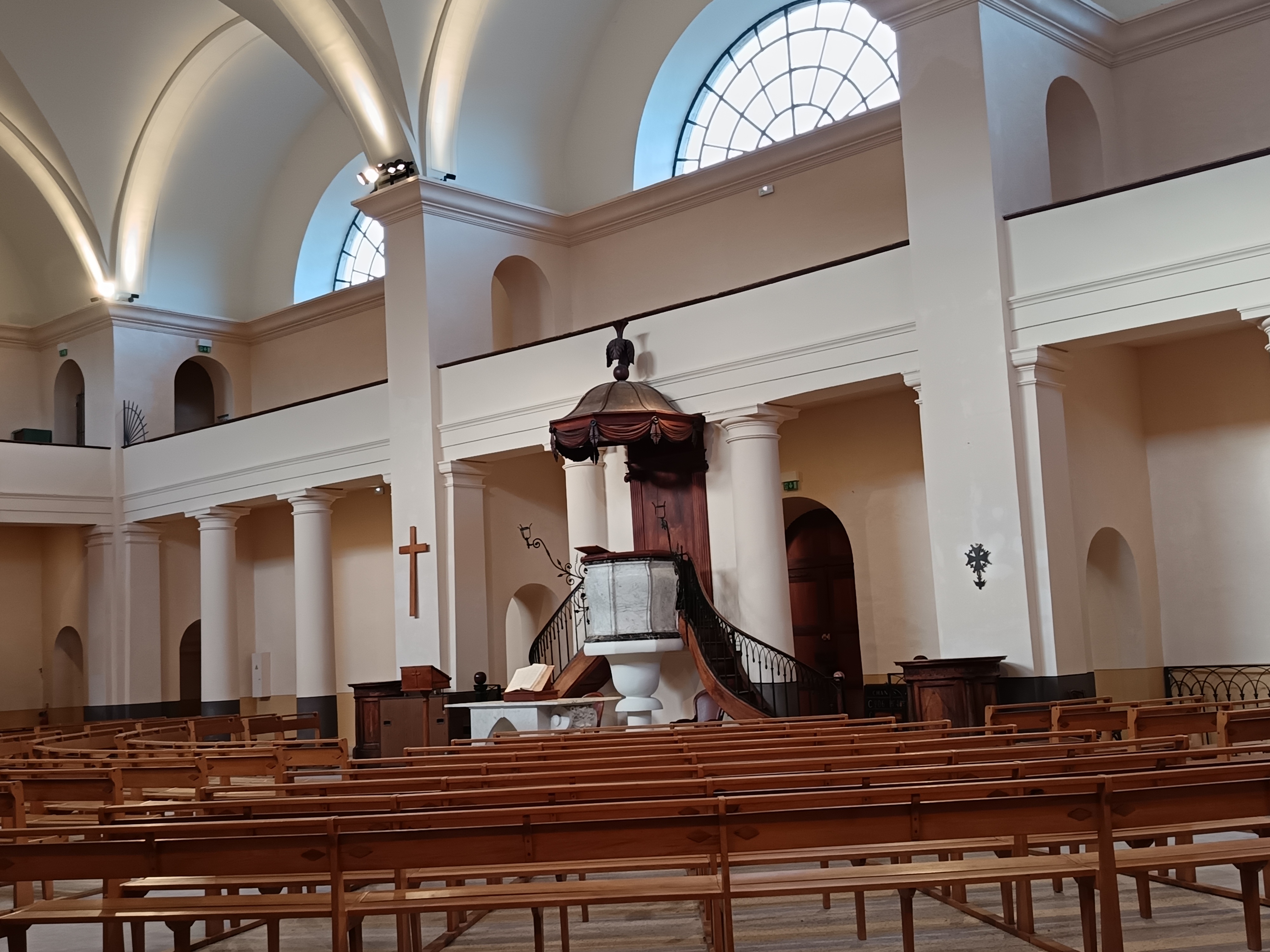 L’intérieur du temple se distingue par son organisation en hémicycle qui fait face à la table de communion en marbre.