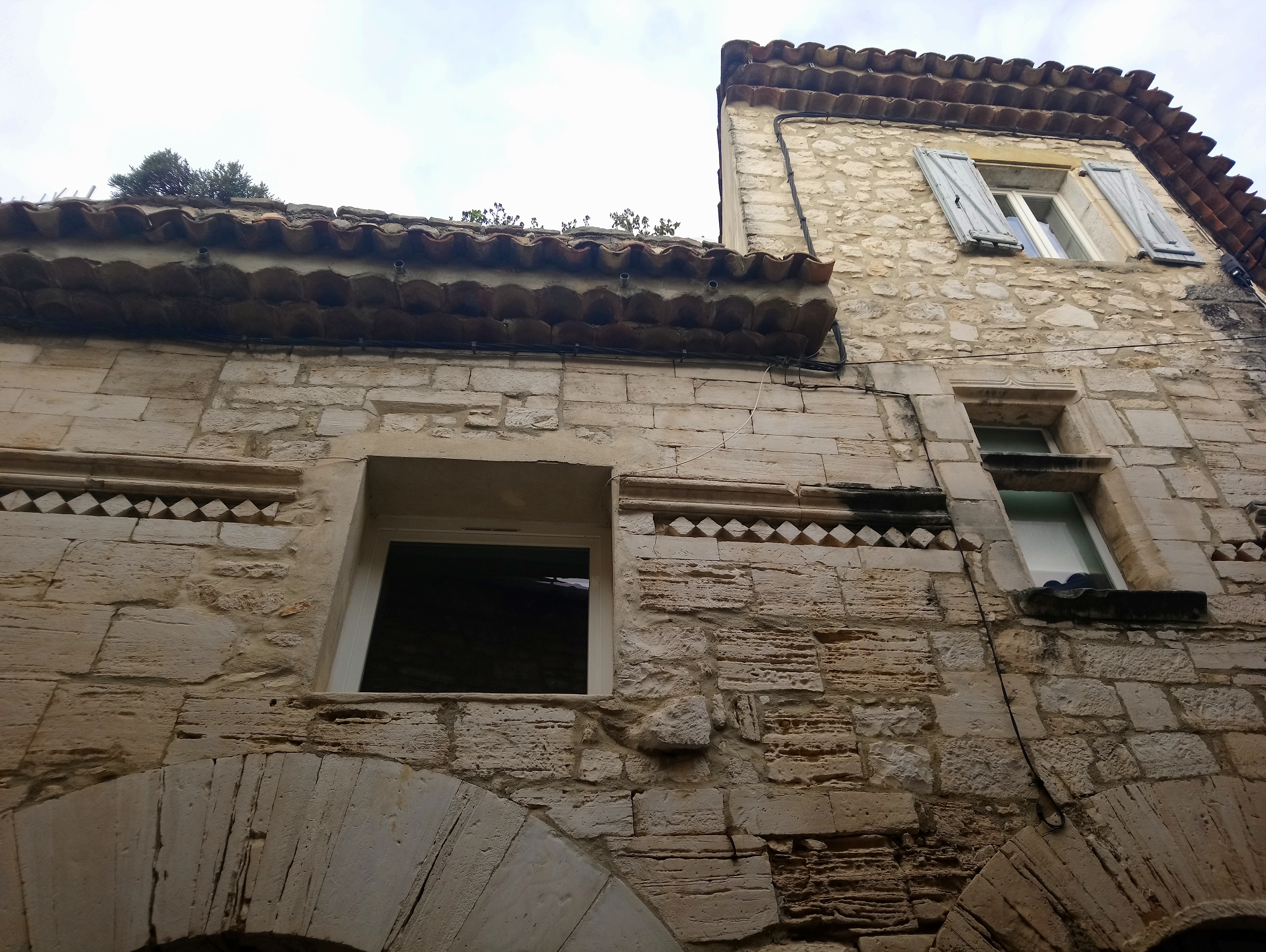 Certaines façades présentent encore aujourd’hui des cordons de losanges surmontés de moulures. C’est un style de décor fréquent sur les archivoltes des portails romans de la région que l’on retrouve notamment sur la chapelle de Saint-Hilaire-de-Brethmas.