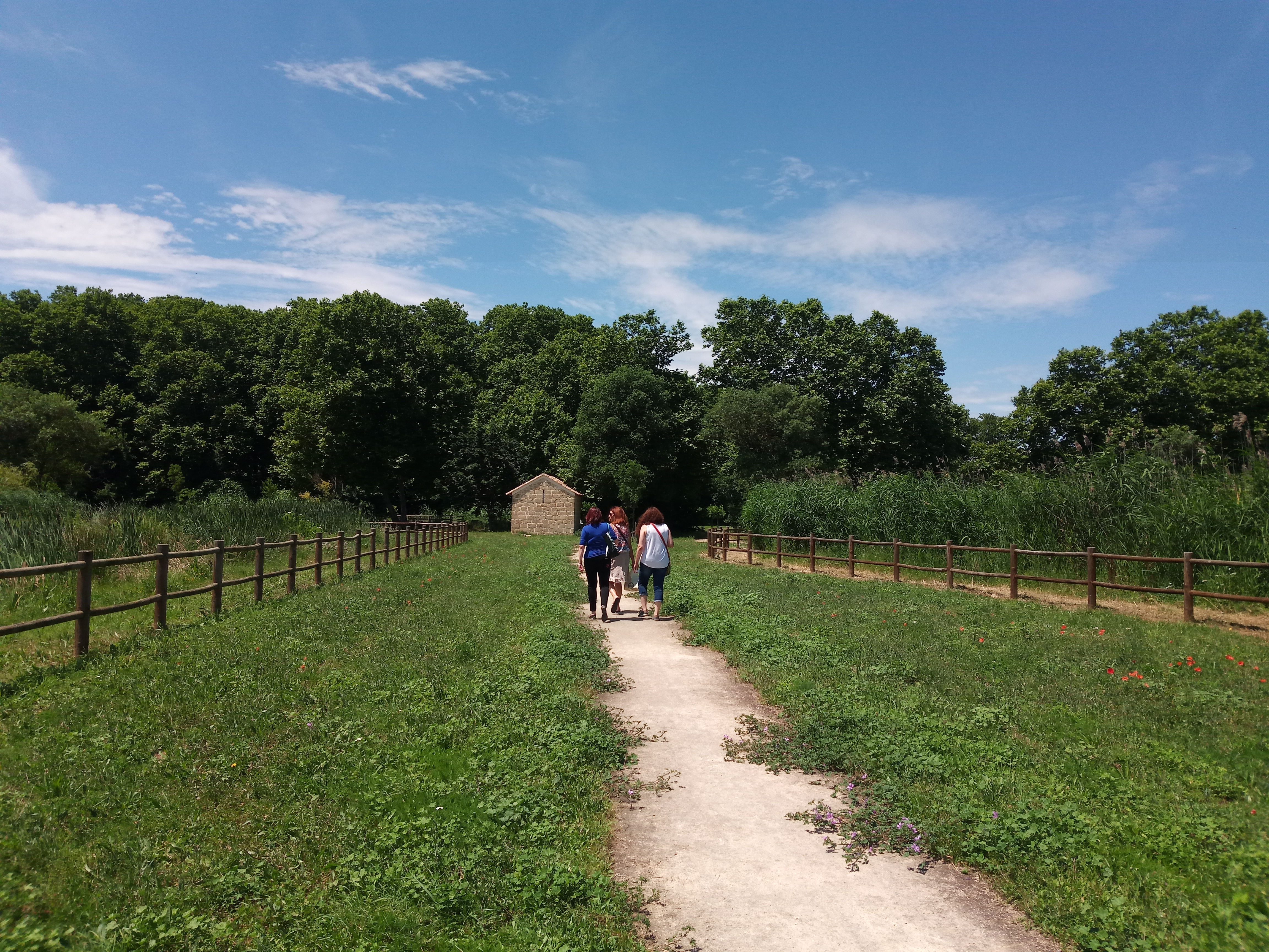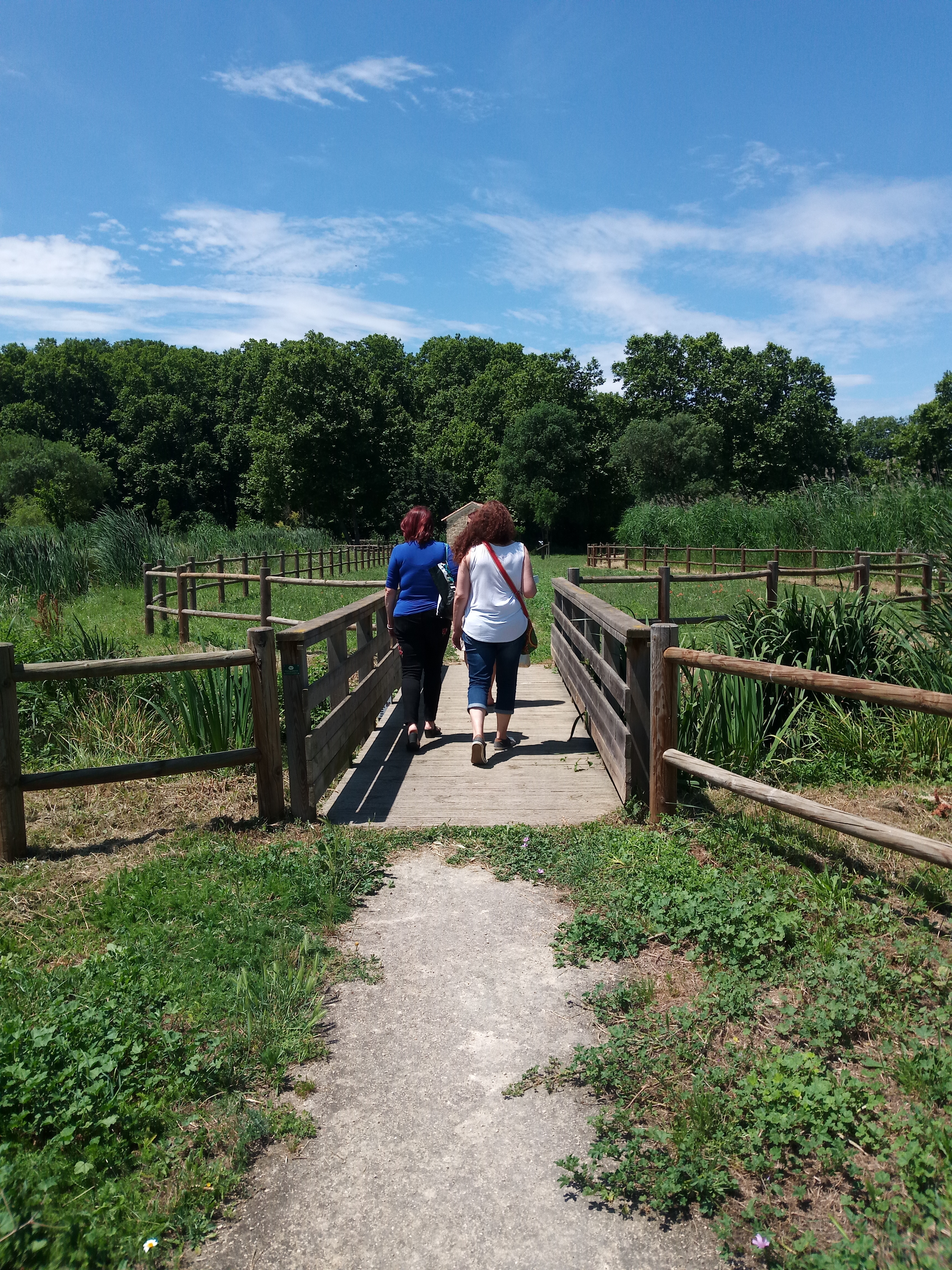Parc avec une agréable balade sur des chemins plats entre bambous, roseaux, iris des marais et grands platanes, un terrain de football, des tables de pique-nique, des WC publics et des jeux pour enfants.