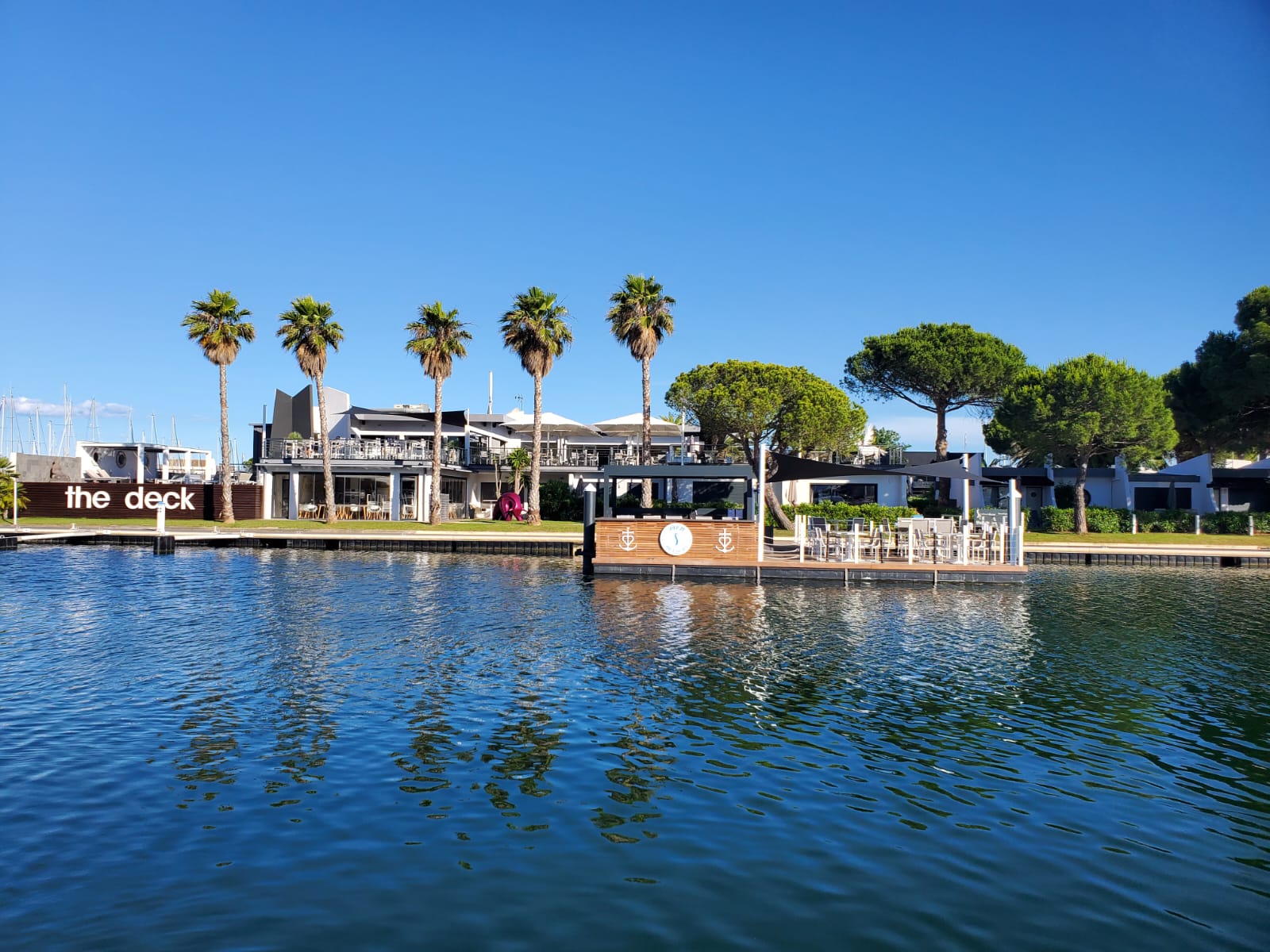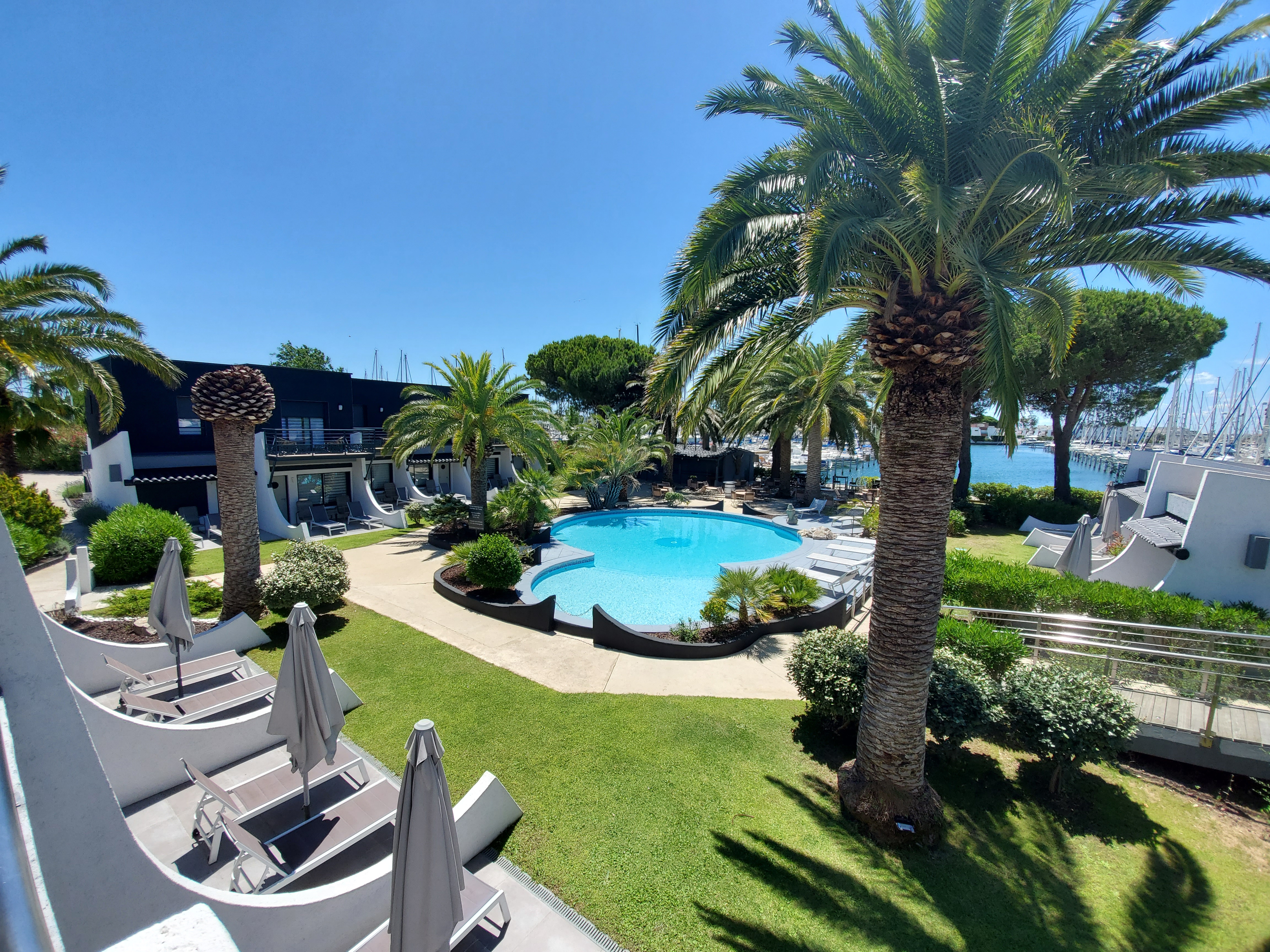 LE GARDEN-GRILL sous les palmiers et pins parasols entre le canal et une des piscine pour savourer poissons grillé s, viandes grillées, salades ou encore fruits de mers.